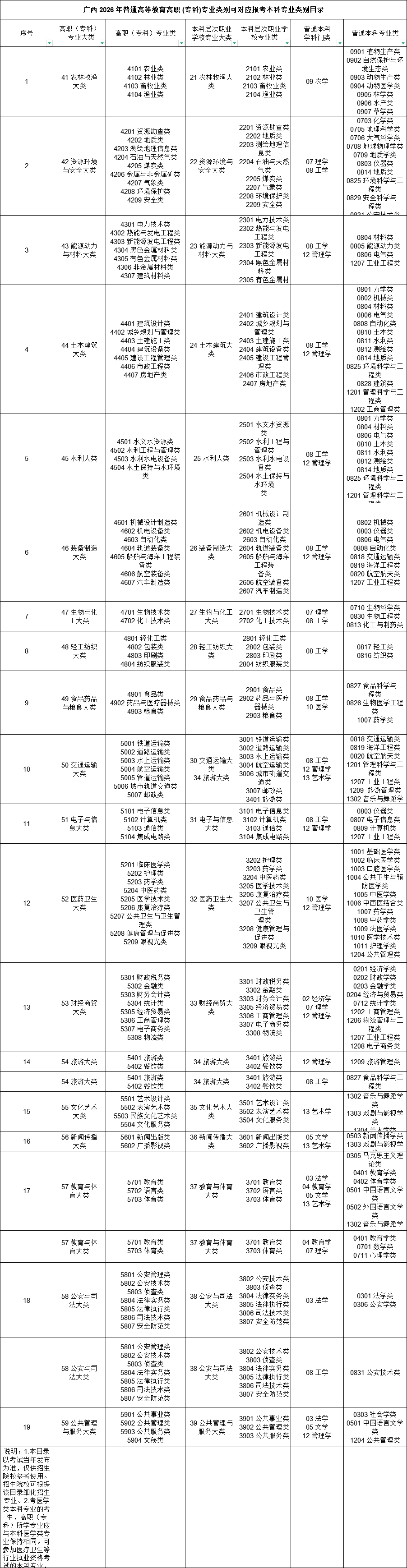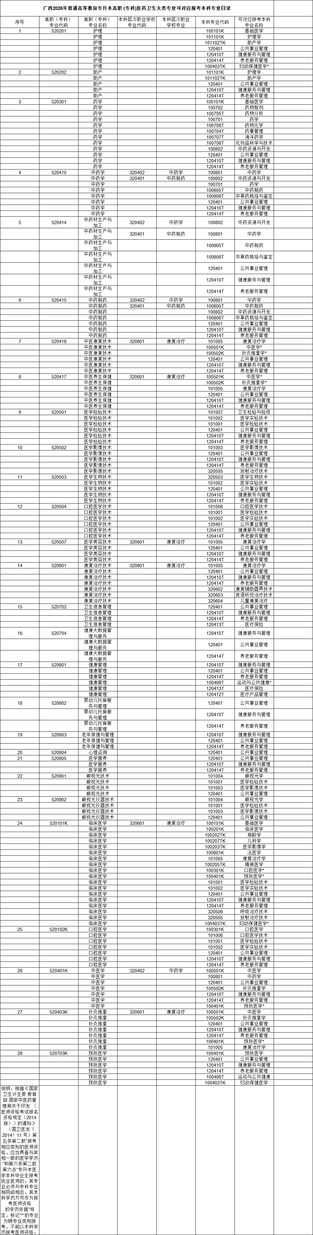 所有考生必须根据所就读的高职(专科)专业,对照《广西2026年普通高等教育高职(专科)专业类别可对应报考本科专业类别目录》(详见附件1)《广西2026年普通高等教育专升本高职(专科)医药卫生大类专业可对应报考本科专业目录》(详见附件2),结合招生院校的具体要求选择对应考试科目(详见附件3)。