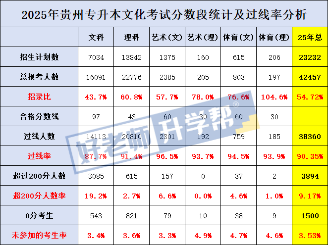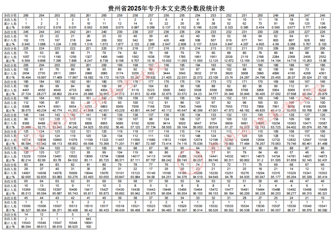 总结: 2025年贵州专升本文史类报考人数为16091人,文化课最高分数为266,0分考生人数为543人。