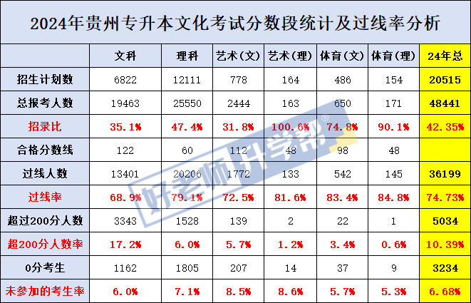 总结: 2025年贵州专升本理工类报考人数为22776人,文化课最高分数为264,0分考生人数为821人。 2025年理工类文化课合格分数线为43,过线人数为20810,过线率约为91.4%。达200分人数为615人,占总报考人数约前2.7%。 总结: 2025年贵州专升本艺术文类报考人数为2385人,文化课最高分数为246,0分考生人数为79人。 2025年艺术(文)类文化课合格分数线为60,过线人数为2301,过线率约为96.5% 。达200分人数为157人,占总报考人数约前6.6%。 总结: 2025年贵州专升本艺术理类报考人数为205人,文化课最高分数为180,0分考生人数为10人。 2025年艺术(理)类文化课合格分数线为30,过线人数为192,过线率约为93.7% 。没有达200分以上的人。 总结: 2025年贵州专升本体育文类报考人数为803人,文化课最高分数为250,0分考生人数为38人。 2025年体育(文)类文化课合格分数线为60,过线人数为759,过线率约为94.5% 。达200分人数为37人,占总报考人数约前4.6%。 总结: 2025年贵州专升本体育理类报考人数为197人,文化课最高分数为220,0分考生人数为9人。 2025年体育(理)类文化课合格分数线为30,过线人数为185,过线率约为93.9% 。达200分人数为2人,占总报考人数约前1%。