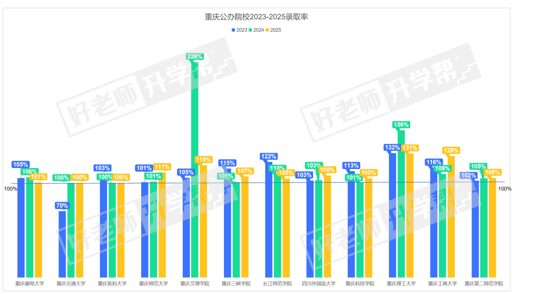 近三年录取率都超计划录取的学校有:重庆文理学院、长江师范学院、四川外国语大学、重庆理工大学、重庆工商大学、重庆第二师范学院