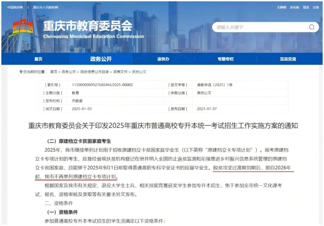 所以,今天再次给大家强调下——自2026年起,重庆不再单列原建档立卡专项计划。