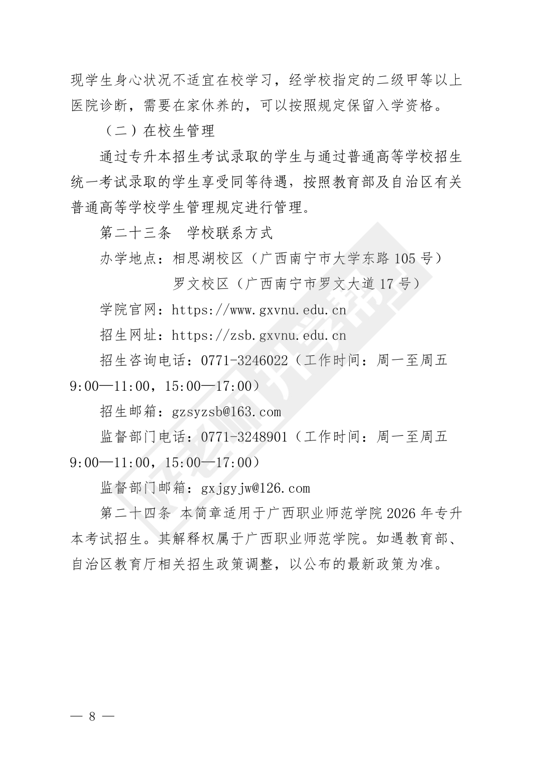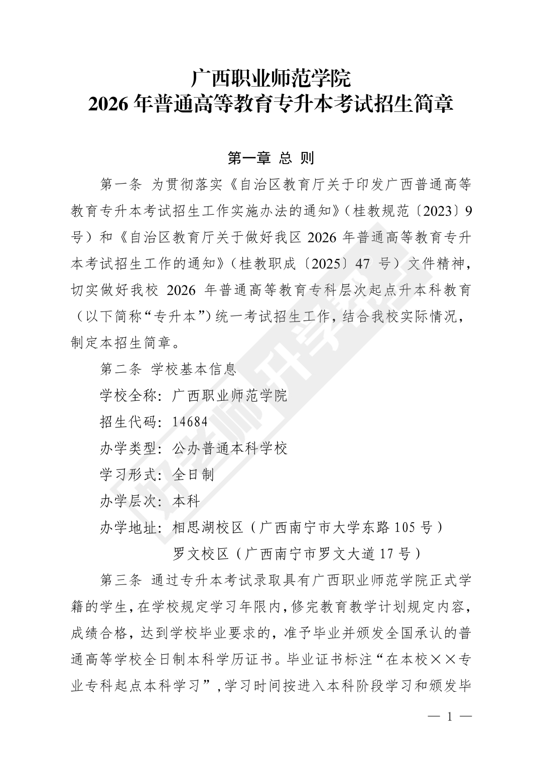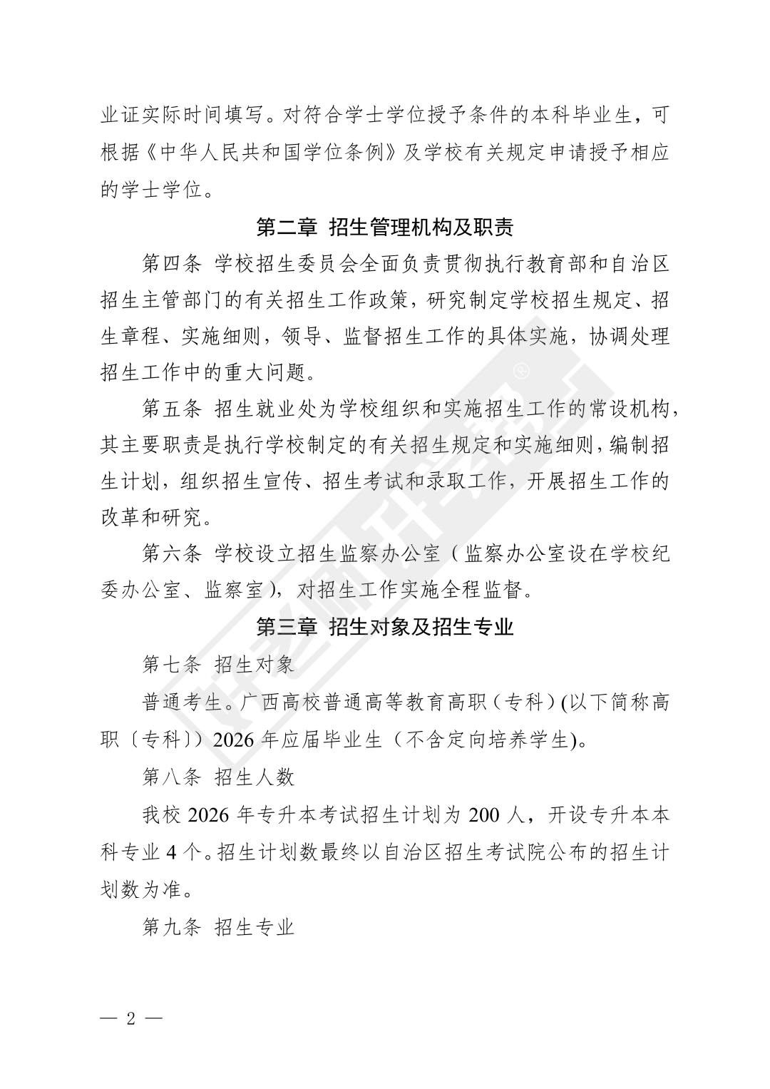 为贯彻落实<<自治区教育厅关于印发广西普通高等教育专升本考试招生工作实施办法的通知>>(桂教规范(2023)9号)和<<自治区教育厅关于做好我区2026年普通高等教育专升本考试招生工作的通知>>(桂教职成(2025)47号)文件精神,切实做好我校2026年普通高等教育专科层次起点升本科教育(以下简称"专升本")统一考试招生工作,结合我校实际情况,制定本招生简章。