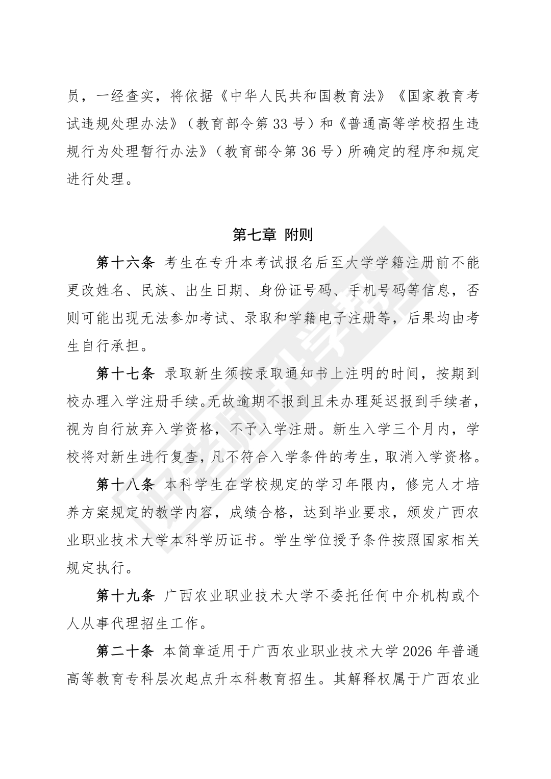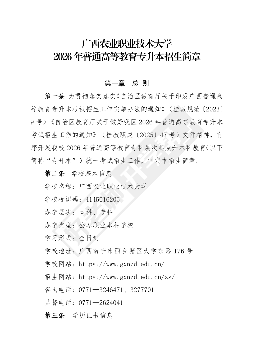 为贯彻落实落实<<自治区教育厅关于印发广西普通高等教育专升本考试招生工作实施办法的通知>>(桂教规范(2023)9号)<<自治区教育厅关于做好我区2026年普通高等教育专升本考试招生工作的通知>>(桂教职成(2025)47号)文件精神,有序开展我校2026年普通高等教育专科层次起点升本科教育(以下简称"专升本")统一考试招生工作,制定本招生简章。