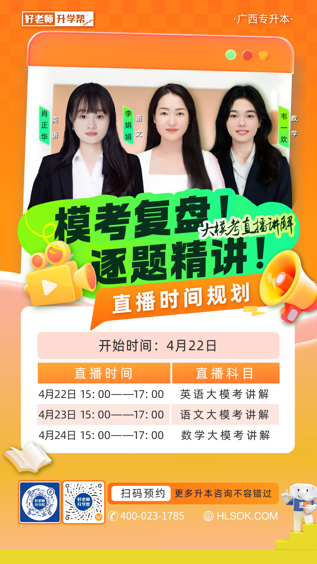 本次直播覆盖核心题型、模考复盘、考点梳理三大核心阶段,贴合专升本考生考前全需求,拒绝无效复习,每一场都是干货满满的 “备考专场”!