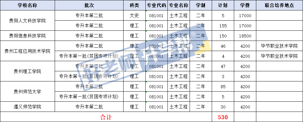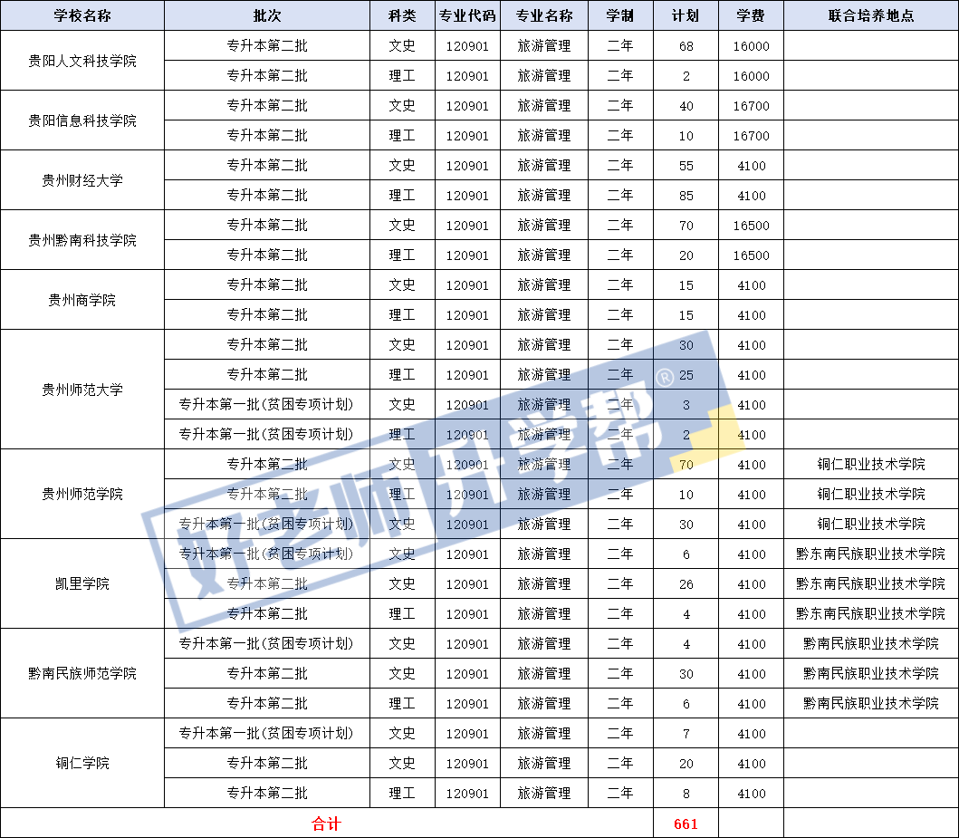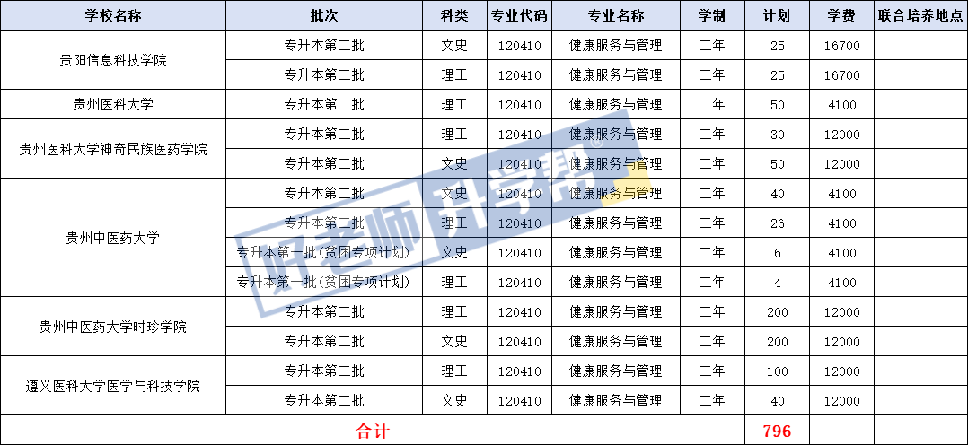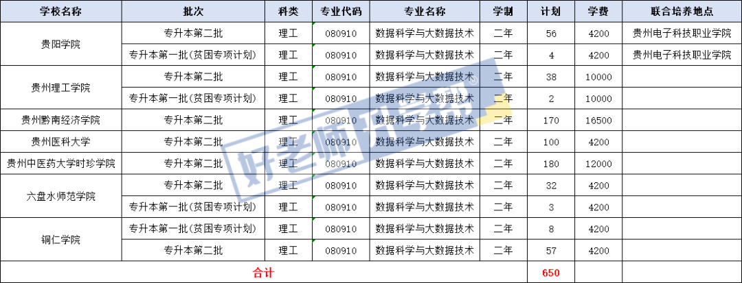 02 计算机科学与技术专业 03 康复治疗专业 04 财务管理专业 05 健康服务与管理专业 2025年贵州专升本招生人数排名TOP5的专业是:健康服务与管理专业,总招生人数达796人,大部分招生院校为医学类院校,具体如下图: 06 旅游管理专业 2025年贵州专升本招生人数排名TOP6的专业是:旅游管理专业,总招生人数661人,招生院校也是相对比较多的。具体如下图: 07 数据科学与大数据技术专业 2025年贵州专升本招生人数排名TOP7的专业是:数据科学与大数据技术专业,总招生人数650人。具体如下图: 08 学前教育专业 2025年贵州专升本招生人数排名TOP8的专业是:学前教育专业,总招生人数580人,具体如下图: 09 土木工程专业 2025年贵州专升本招生人数排名TOP9的专业是:土木工程专业,总招生人数530人。具体如下图: 10 会计学专业