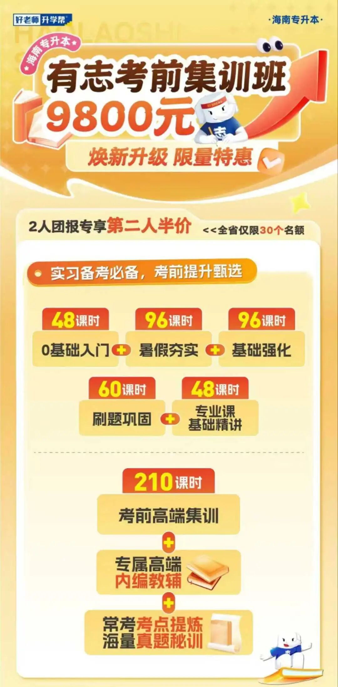 好老师升学帮(专升本)有志考前集训班以焕新升级的教学服务、诚意满满的团购福利、科学高效的备考体系,助力每一位考生突破备考瓶颈,在专升本赛道上稳步前行!