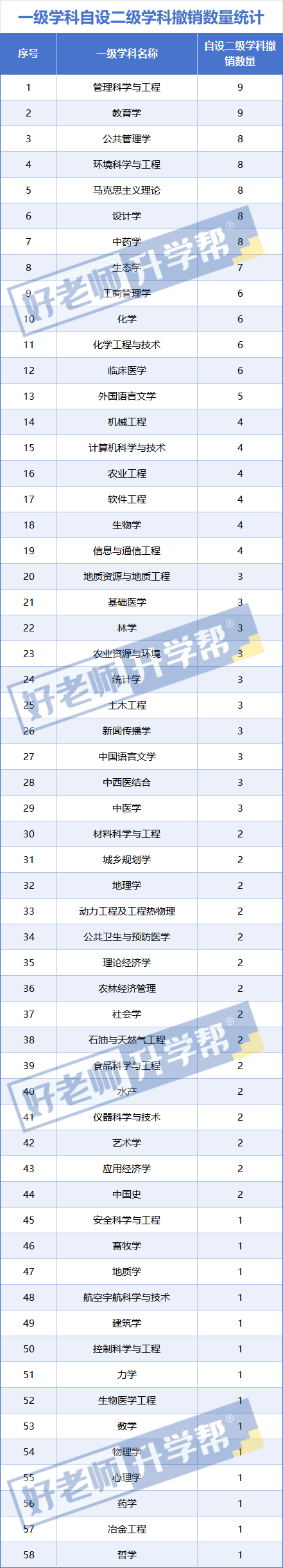 从一级学科角度看,管理科学与工程和教育学下设的自设二级学科撤销数量最多,均为9个;公共管理学、环境科学与工程、马克思主义理论及设计学等次之,撤销数量均为8个。具体如下: