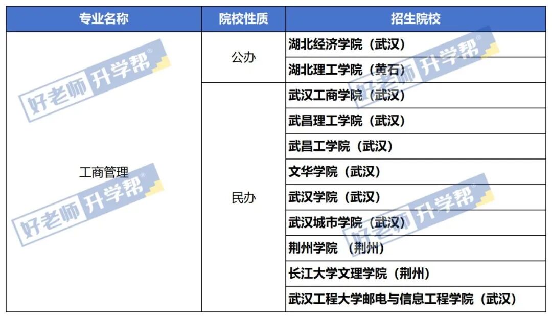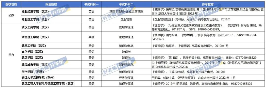 01 专业介绍 【工商管理】属于管理学门类下的工商管理类。在湖北专升本招生中,与此同类的专业还包括会计学、财务管理、审计学、人力资源管理、市场营销及零售业管理等。 该专业主要学习管理学、经济学的基本理论和知识,核心课程通常包括管理学原理、微观经济学、宏观经济学、会计学、财务管理、市场营销学、战略管理以及人力资源管理等,旨在培养学生掌握现代企业管理的方法和技能,能够进行有效的企业经营决策和战略制定。 02 招生院校 工商管理专业的招生院校有11所,其中有2所公办院校、9所民办院校,对比2024年,新增了两所院校:湖北经济学院(公办)、文华学院(民办),停招了两所院校:黄冈师范学院(公办)、武汉工程科技学院(民办) 03 报考要求与学费 该专业有3所院校不限制专业报考:武汉工商学院(民办)、武汉工程大学邮电与信息工程学院(民办)、武汉学院(民办) 04 考试科目及参考教材 11所招生院校中有1所院校需要需要考试3门科目:湖北经济学院 05 2025专业报录比&近几年专业考情 自2024年起,工商管理专业在专升本招生中增设了公办院校,这对有意报考的同学来说无疑是一个利好消息,意味着更多进入公办机会。该专业的报考门槛相对较低,在招生院校中有三所不设任何限制,多数院校也实行文理兼收政策,因此也非常适合跨专业考生选择。 值得注意的是,去年该专业公办院校的报录比为56.73%,而今年已下降至40.67%。这一变化提醒同学们,若想成功考入公办院校,必须付出更多努力,尽早启动备考工作。毕竟,扎实的准备和优异的成绩才是专升本成功升学的关键所在。 (以上数据以报考最后一天12:00数据为依据进行统计,非最终数据,仅供考生参考。) 06 就业&考研方向 1. 就业: 2. 考研: