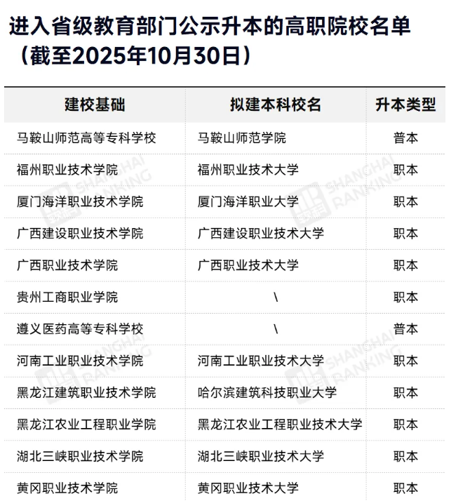 2025年10月以来,安徽、山东、福建等多地省级教育部门公示了新一批拟设本科高校,其中多所拟设本科高校建校基础为高职专科院校。