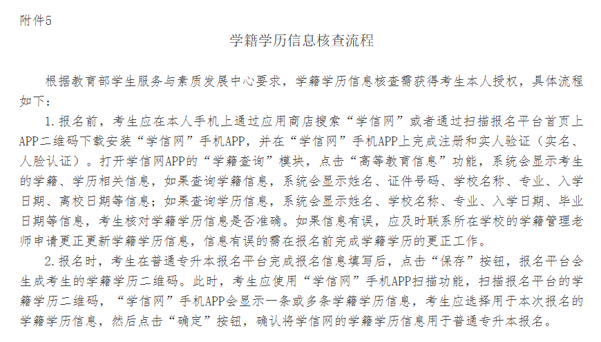 网络报名期间,省报名平台开放时间为每天8:00-20:00。2026年普通专升本网上报名需进行学籍学历校验。所有报名考生通过“学信网”手机APP对本人学籍学历信息进行核查。所有考生在报名前须先完成“学信网”手机APP下载和学籍学历核查及信息更正工作,核准无误后方可在省报名平台进行报名,对未进行核查或核查发现信息与本人信息不一致且在报名前未完成信息更正更新的考生,省报名平台将禁止该类考生报名,信息不一致的考生需及时联系当前就读学校学籍管理部门。学籍学历信息核查流程见附件5。