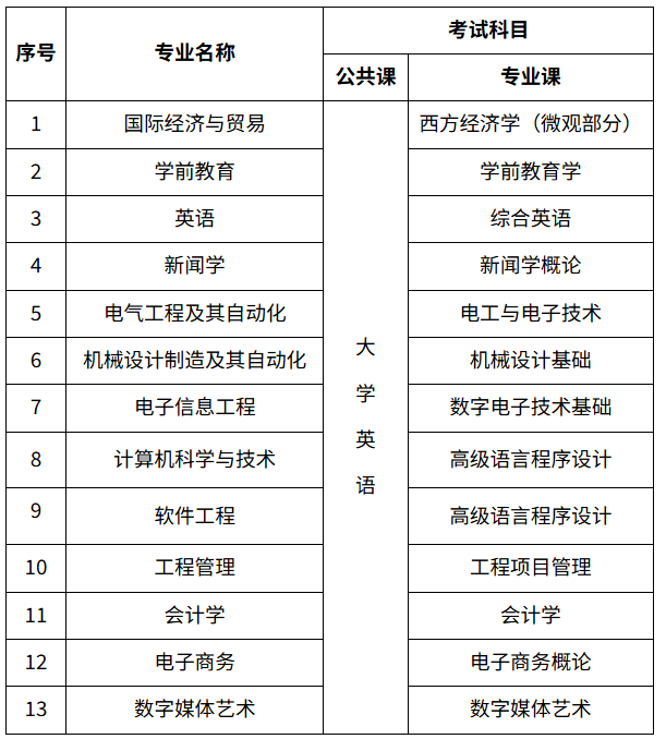 1.普通考生。考试科目为公共课和专业课各1门。公共课科目为英语,实行全省统一命题、统一考试、统一评卷。专业课科目由学校自主确定并封闭命题、阅卷。考试要求和参考教材详见附件,考试科目见下表: