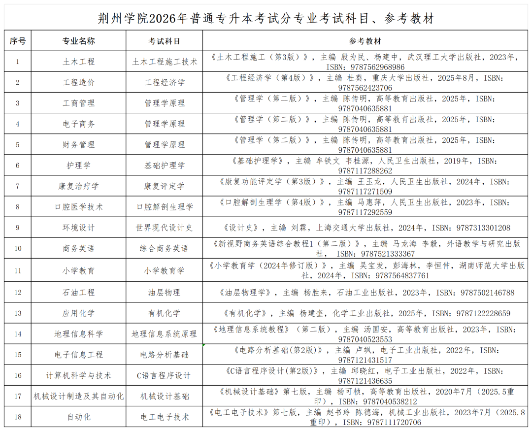 3.荆州学院2026年普通专升本考试分专业考试科目、参考教材