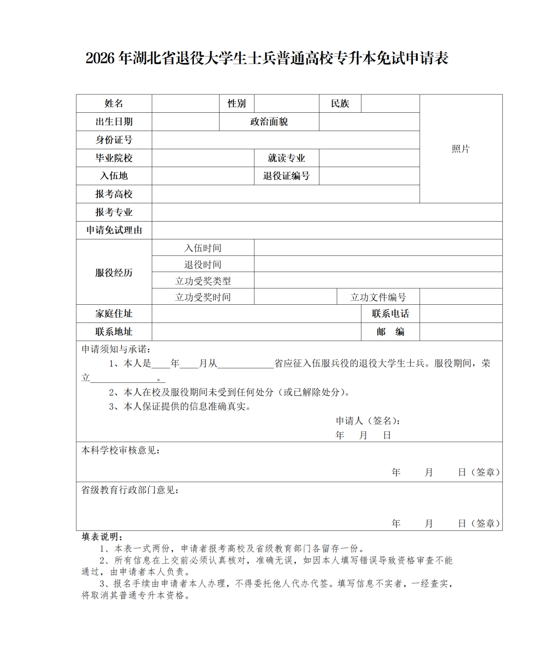 2.2026年湖北省退役大学生士兵普通高校专升本免试申请表