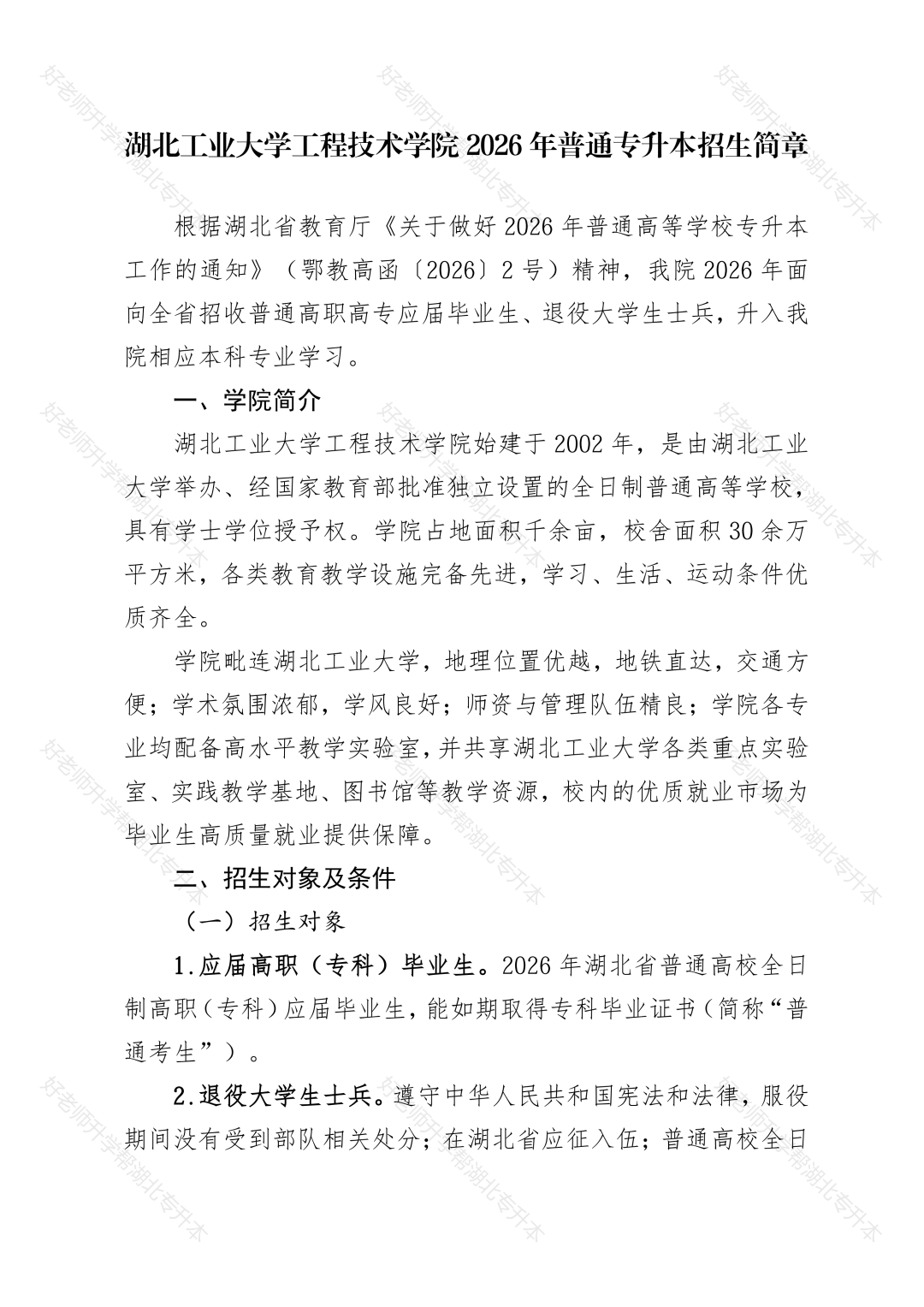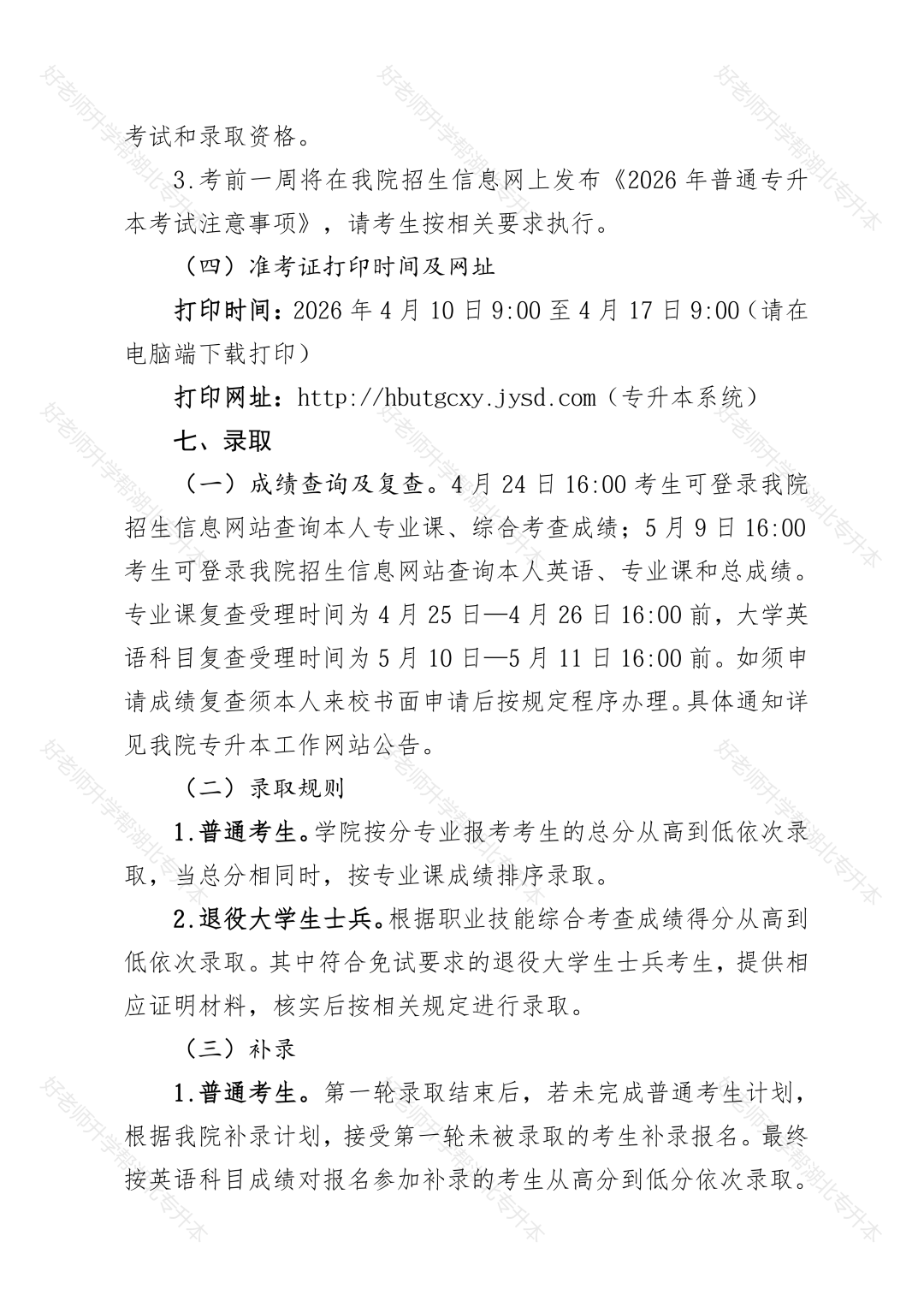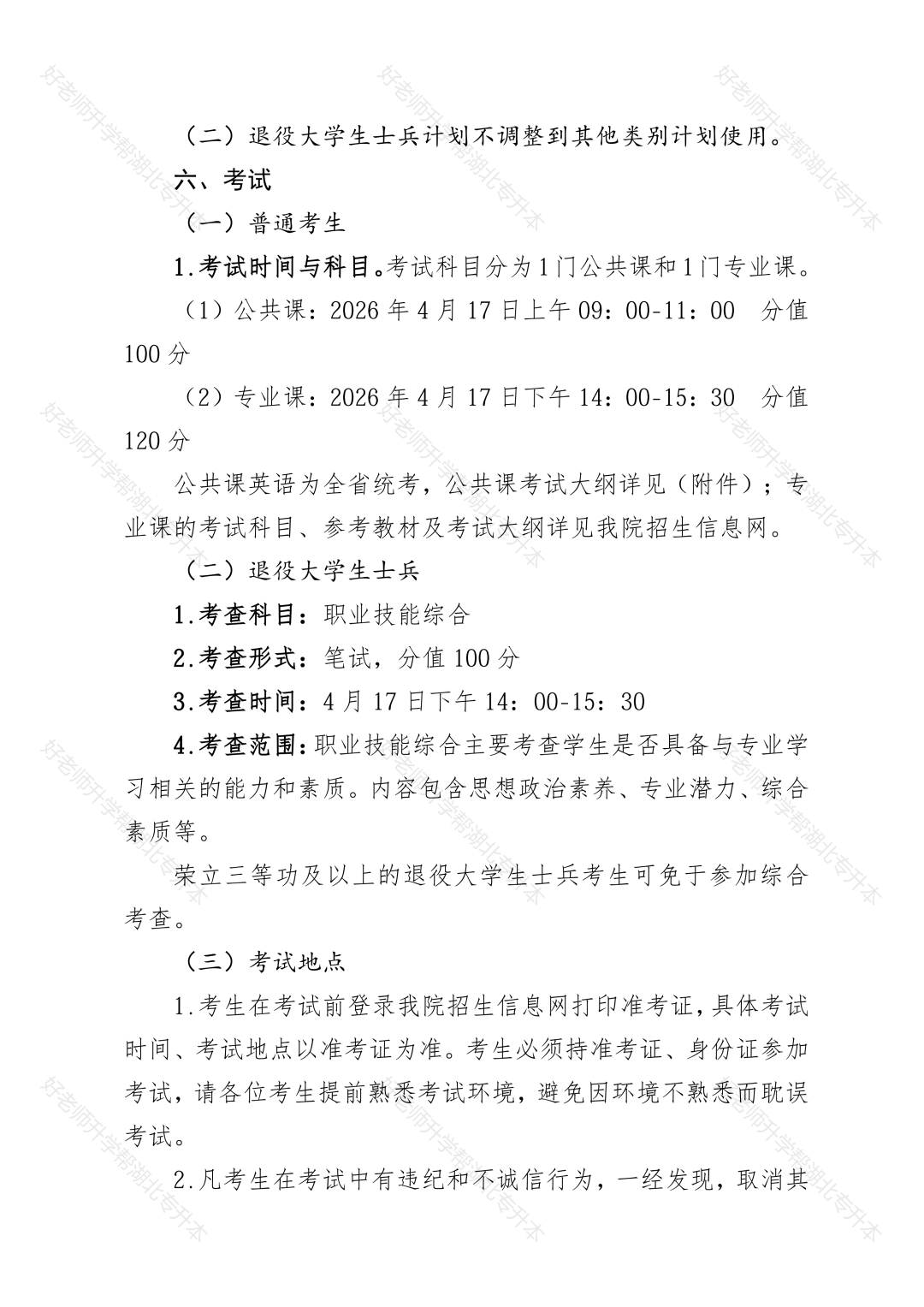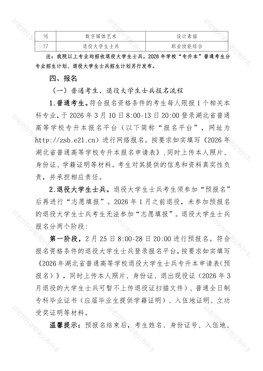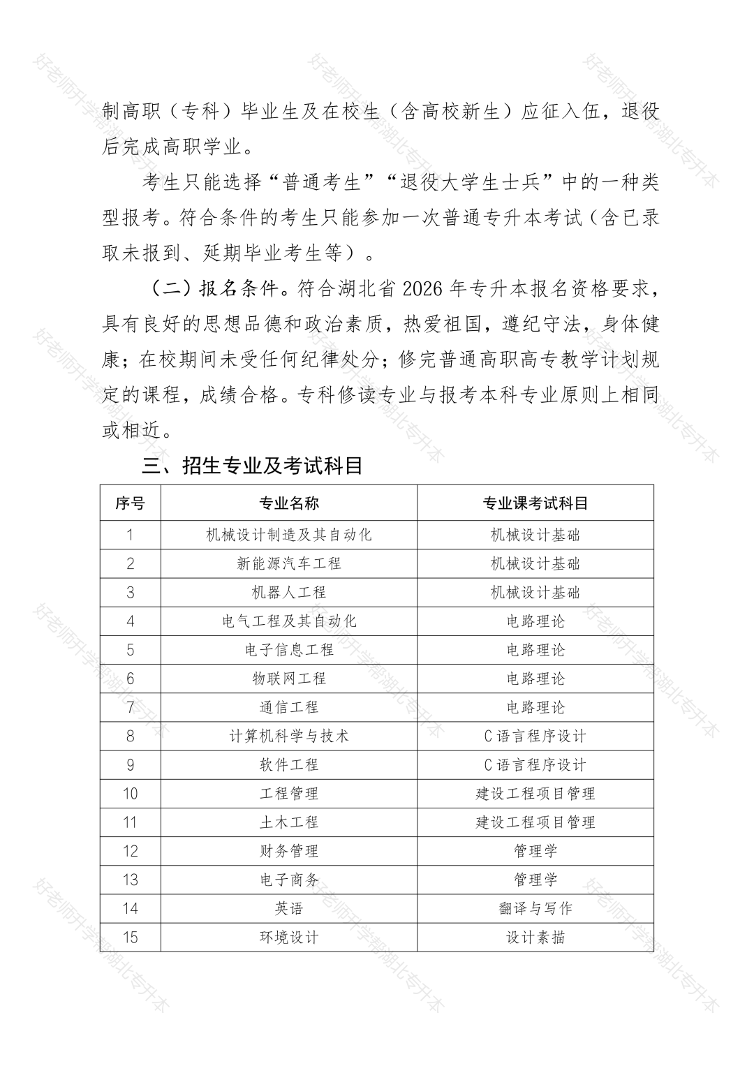 根据湖北省教育厅《关于做好2026年普通高等学校专升本工作的通知》(鄂教高函(2026)2号)精神,我院2026年面向全省招收普通高职高专应届毕业生、退役大学生士兵,升入我院相应本科专业学习。