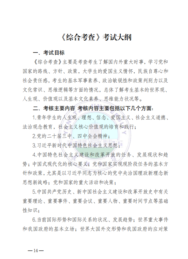 《综合考查》主要是考查考生了解国内外重大时事,学习党和国家的路线、方针、政策,大学生的爱国主义情怀,民族自尊心和社会责任感,考生的基本军事素养、政治敏锐性和政策判别力以及文化常识、思维逻辑等方面的情况,总体了解考生基本的世界观、人生观、价值观以及基本文化素养、思维能力状况等。