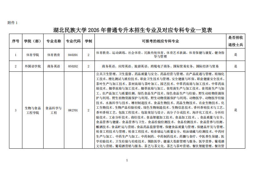湖北民族大学2026年普通专升本招生专业及对应专科专业一览表