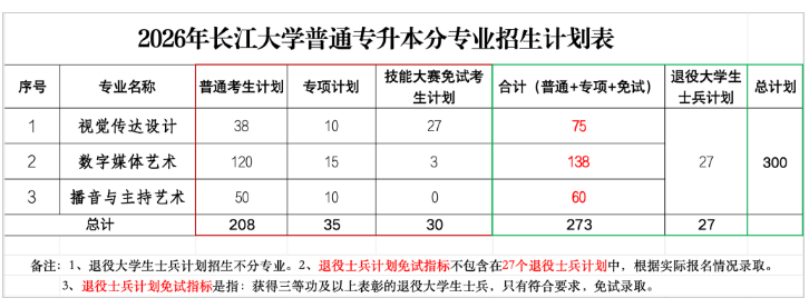 根据《省教育厅关于做好2026年湖北省普通高等学校专升本工作的通知》(鄂教高函〔2026〕2号)精神,我校2026年专升本招生总计划300名,其中普通考生计划208名、专项计划考生35名、技能大赛免试考生30名、退役大学生士兵计划27名(不含退役大学生士兵免试计划)。分专业招生计划见下表: