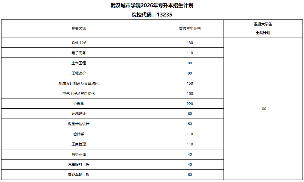武汉城市学院 2026 年专升本总计划招生 1450 人,其中: 普通考生计划:1350 人 退役大学生士兵计划:100 人