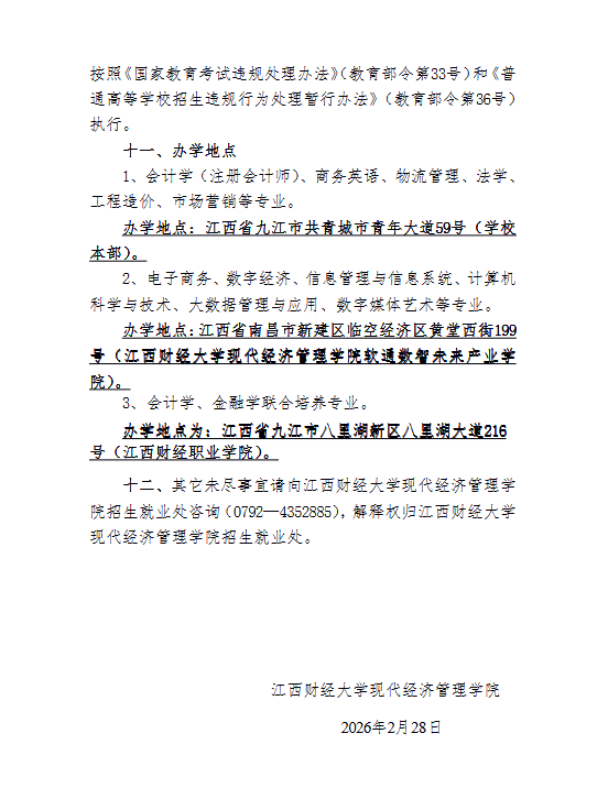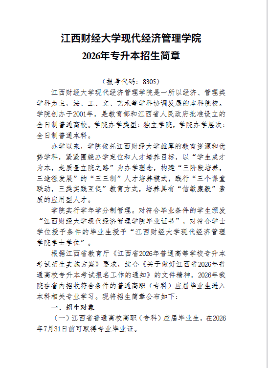 江⻄财经大学现代经济管理学院2026年专升本招生简章