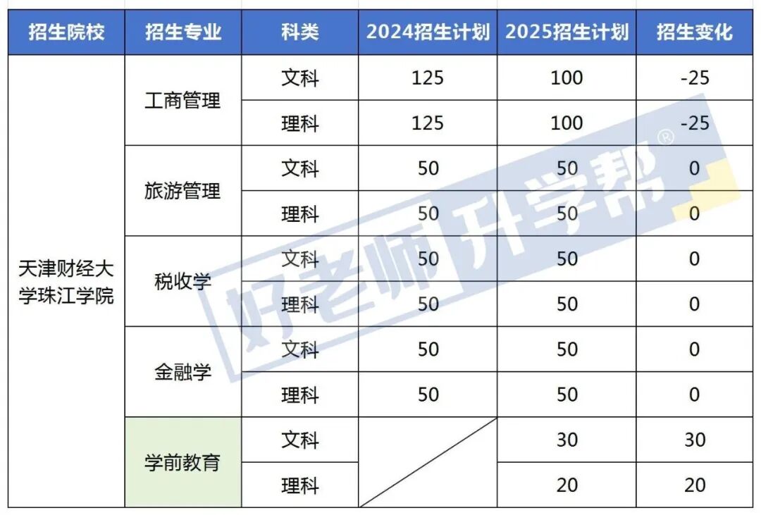 从招生计划来看,2025年天津财经大学珠江学院新增了学前教育专业,文理共招生50人,其中文科招生30,理科招生20,工商管理共减少招生50人,文理各25人,其他专业招生数趋于稳定。