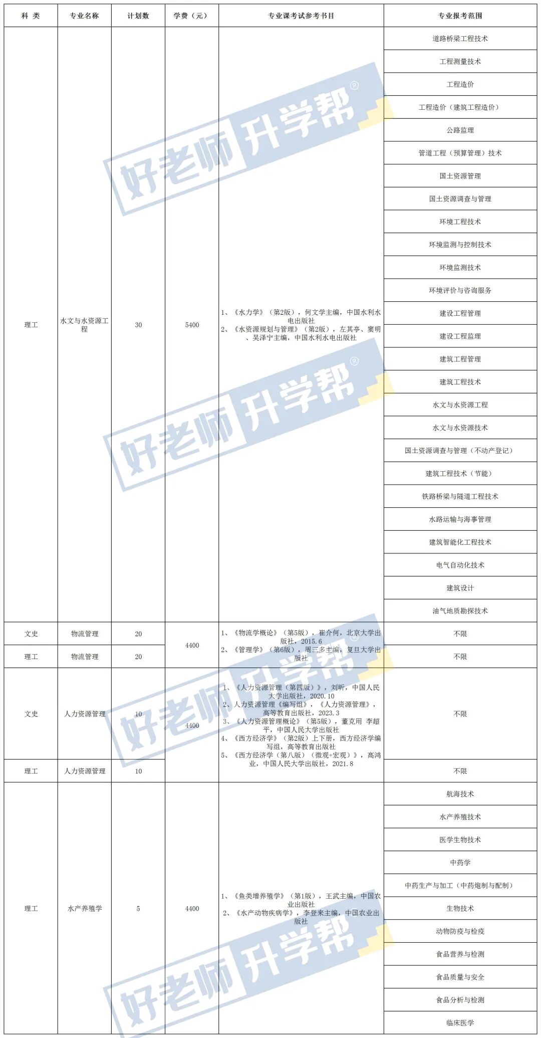 招生要求:要求高职毕业专业为道路桥梁工程技术、工程测量技术、工程造价、工程造价(建筑工程造价)、公路监理、管道工程(预算管理)技术、国土资源管理、国土资源调查与管理、环境工程技术、环境监测与控制技术、环境监测技术、环境评价与咨询服务、建设工程管理、建设工程监理、建筑工程管理、建筑工程技术、水文与水资源工程、水文与水资源技术、国土资源调查与管理(不动产登记)、建筑工程技术(节能)、铁路桥梁与隧道工程技术、水路运输与海事管理、建筑智能化工程技术、电气自动化技术、建筑设计、油气地质勘探技术