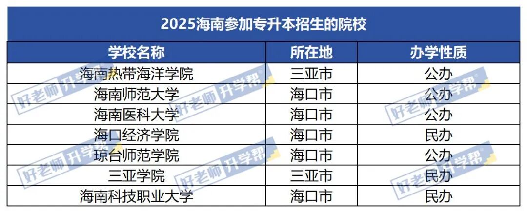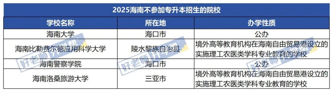 11所本科院校中,7所本科院校参加专升本招生(4所公办本科院校和3所民办本科院校),还有4所本科学校暂不参加海南专升本招生具体名单如下: