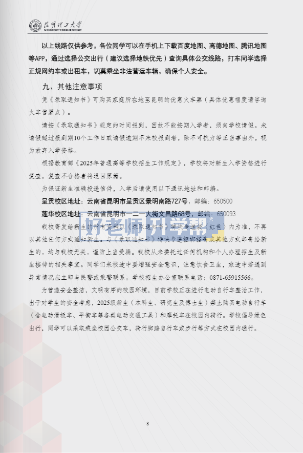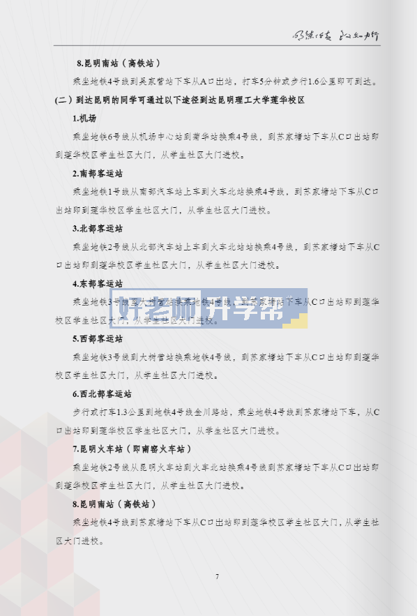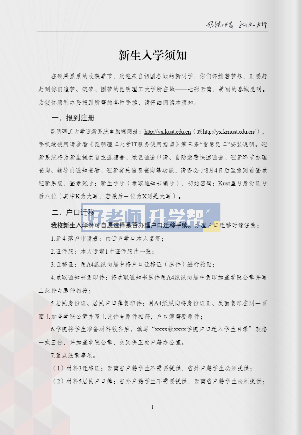 导读:在硕果累累的收获季节,欢迎来自祖国各她的新同学,你们怀指者梦想,正要赶赴到你们追梦、筑梦、圆梦的昆明理工大学所在地--七彩云南,美丽的春城昆明。为使你顺利办妥报到所籍的各种手续,请仔细阅读本须知。