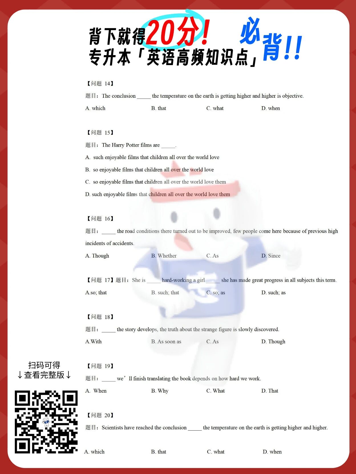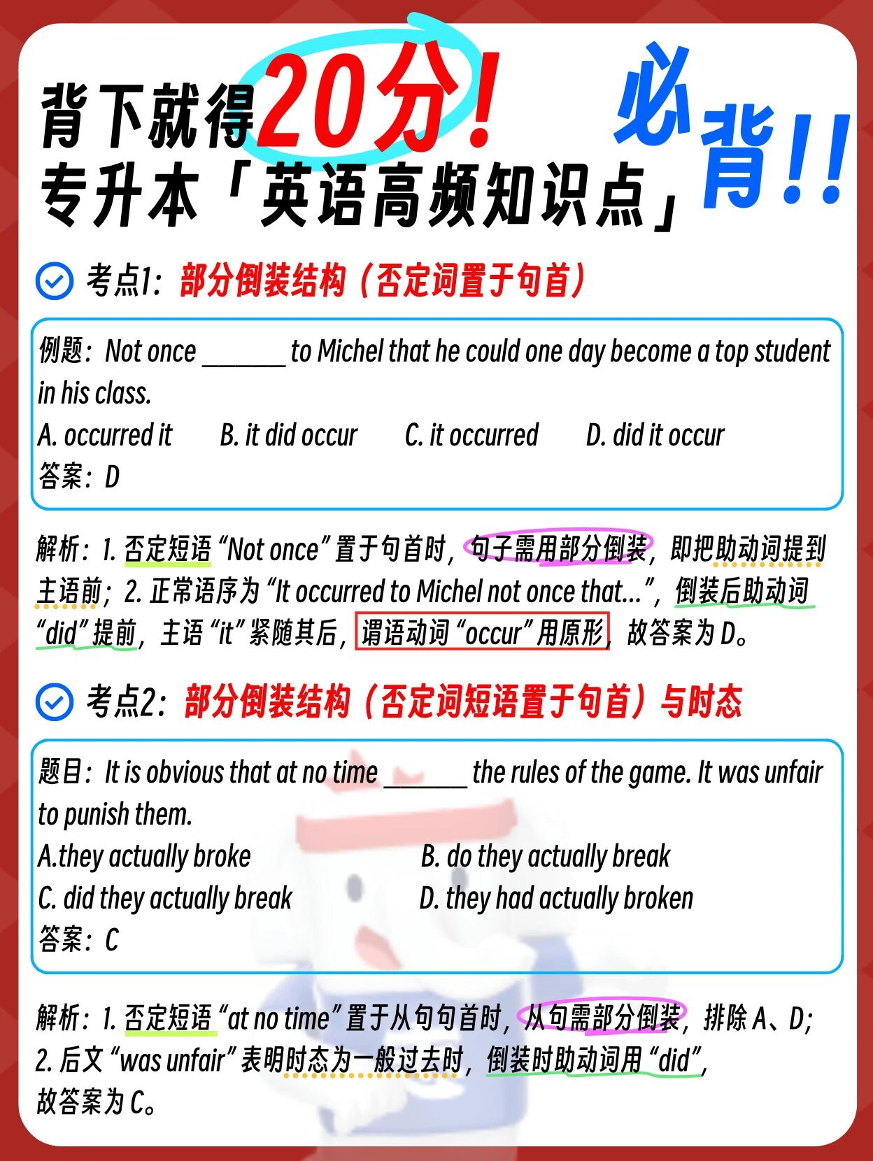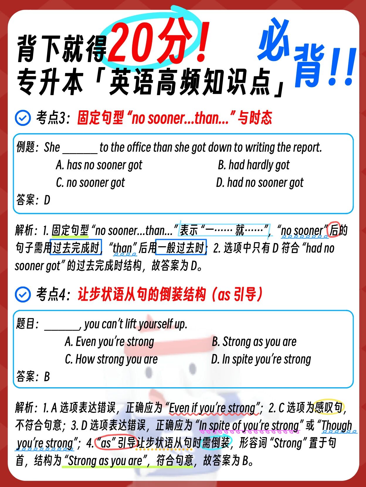 导读:专升本英语高频知识点1.考点:部分倒装结构(否定词置于句首) 2.考点:部分倒装结构(否定词短语置于句首)与时态 3.考点:固定句型 “no sooner...than...” 与时态