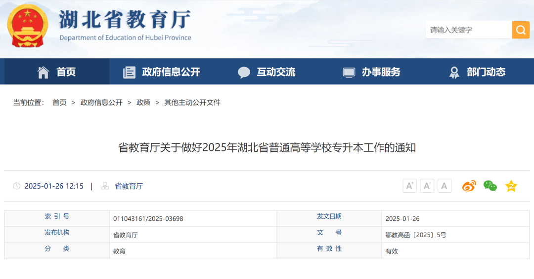 湖北省教育厅官网https://jyt.hubei.gov.cn/)是湖北专升本政策的最高权威发布平台。