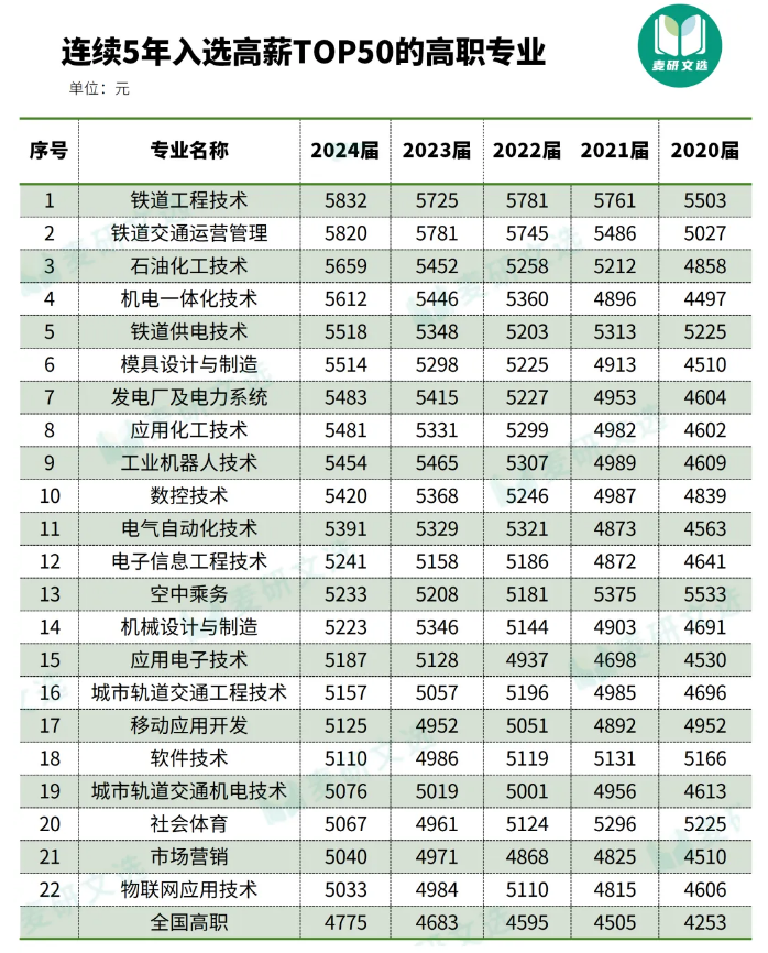 哪些高职专业毕业半年后月收入能连续五年稳居TOP50?这些长期上榜专业的薪资表现与增长趋势如何?麦可思研究数据为你揭晓——