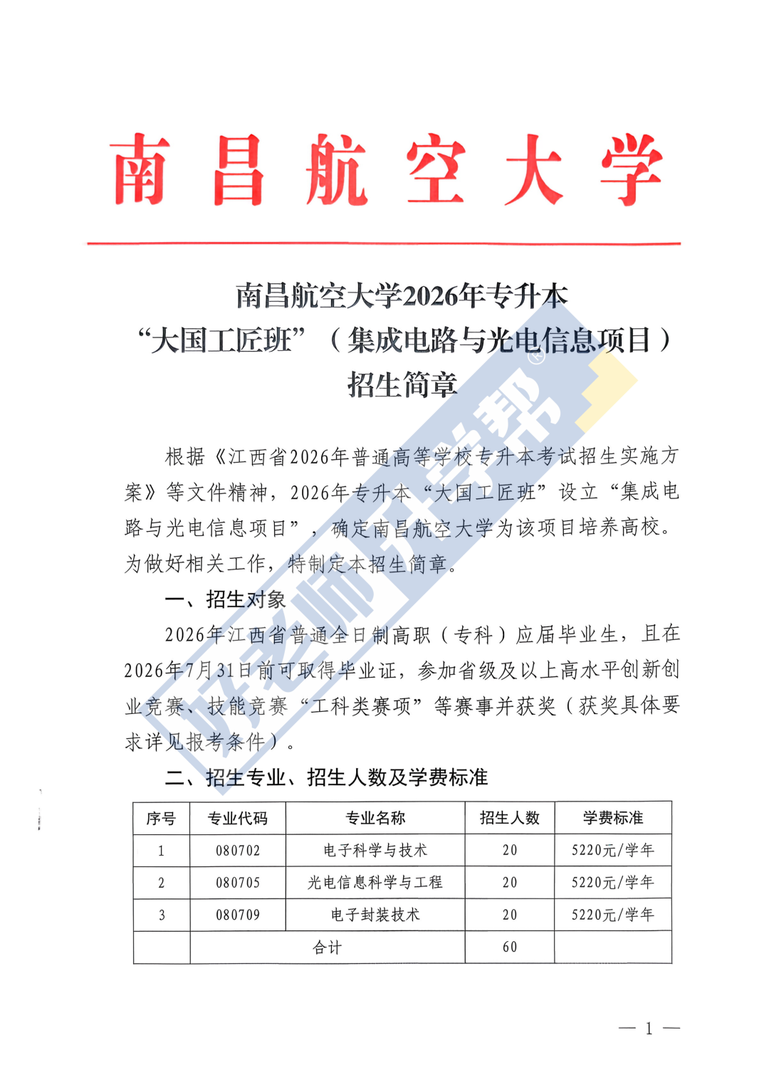 导读:本文是招60人!南昌航空大学2026年专升本“大国工匠班”(集成电路与光电信息项目)招生简章,由好老师升学帮收集整理,仅供参考。