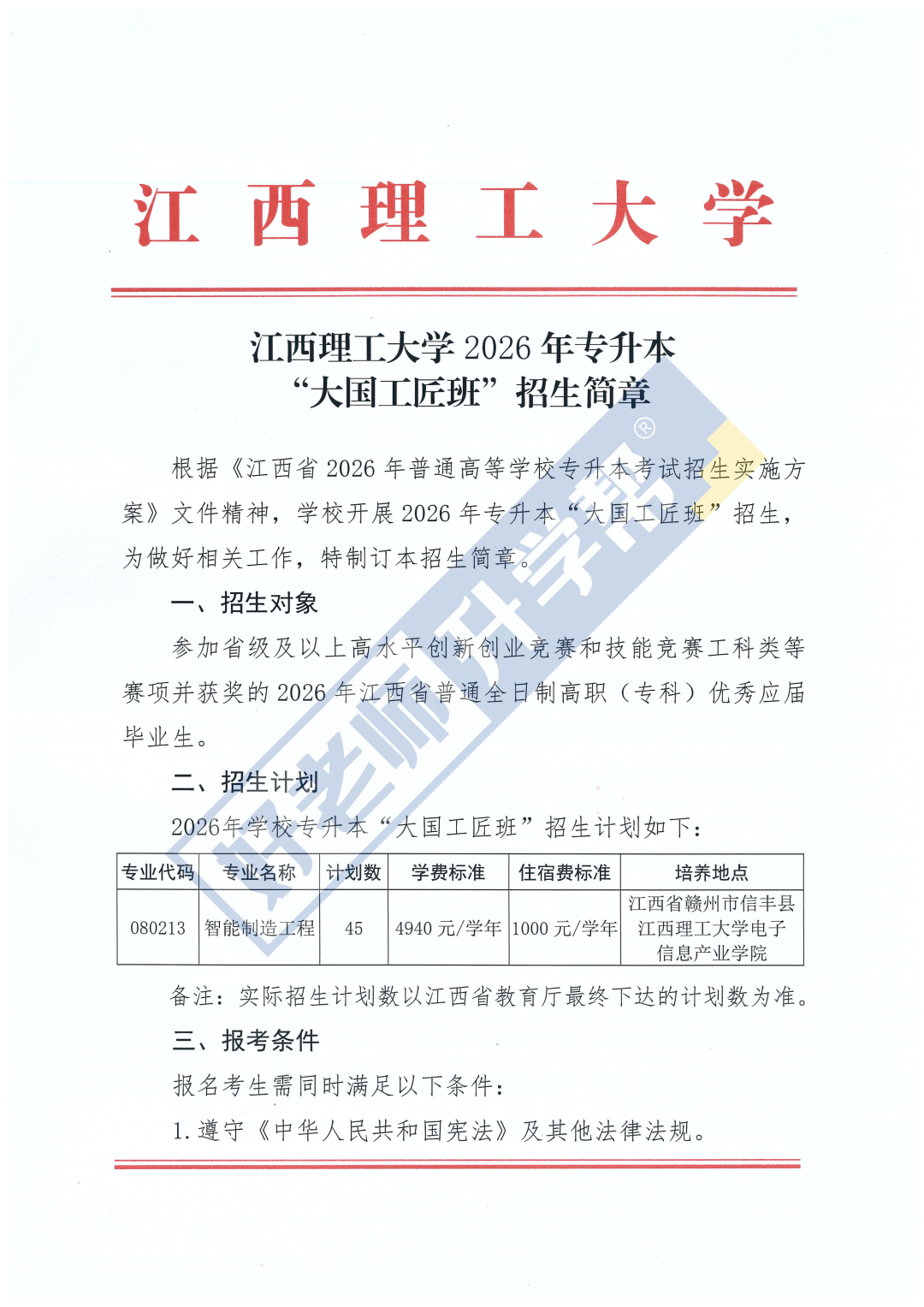 导读:本文是招45人!江西理工大学2026年专升本“大国工匠班”招生简章,由好老师升学帮收集整理,仅供参考。