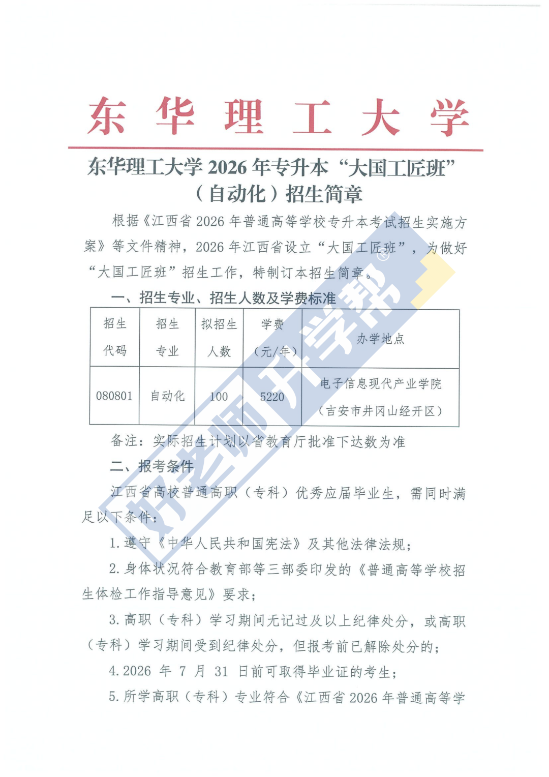 导读:本文是招100人!东华理工大学2026年专升本“大国工匠班”(自动化)招生简章,由好老师升学帮收集整理,仅供参考。