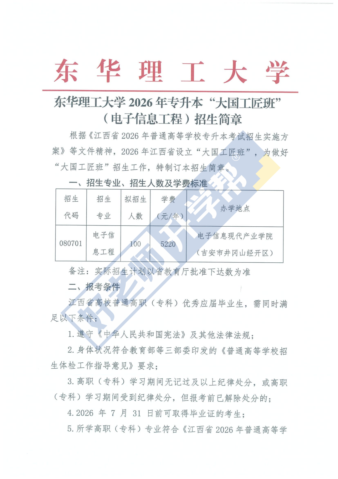 导读:本文是招100人!东华理工大学2026年专升本“大国工匠班”(电子信息工程)招生简章,由好老师升学帮收集整理,仅供参考。