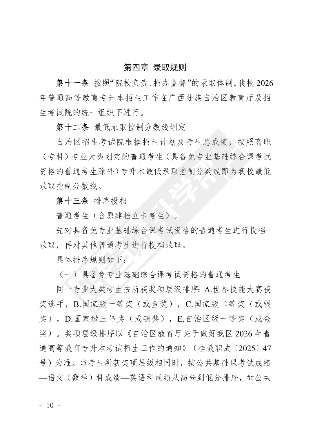 为贯彻落实<<自治区教育厅关于印发广西普通高等教育专升本考试招生工作实施办法的通知>>(桂教规范(2023)9号)和<<自治区教育厅关于做好我区2026年普通高等教育专升本考试招生工作的通知>>(桂教职成(2025)47号)文件精神,结合学校实际情况,制定本招生简章。