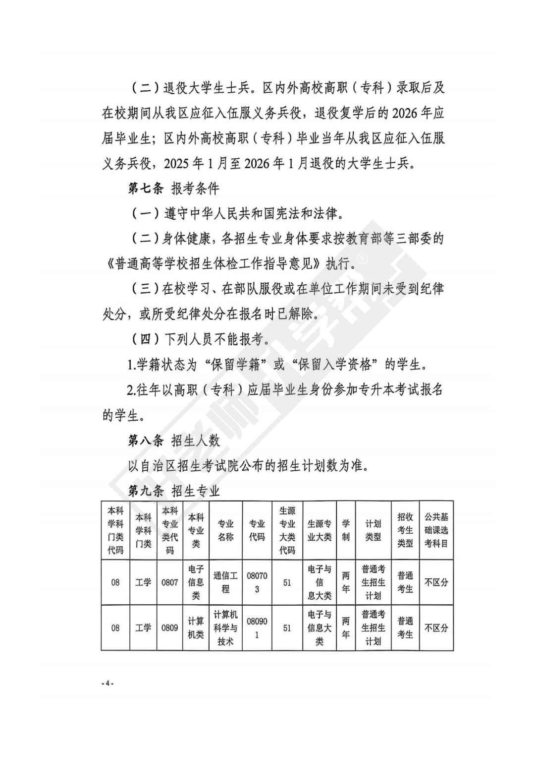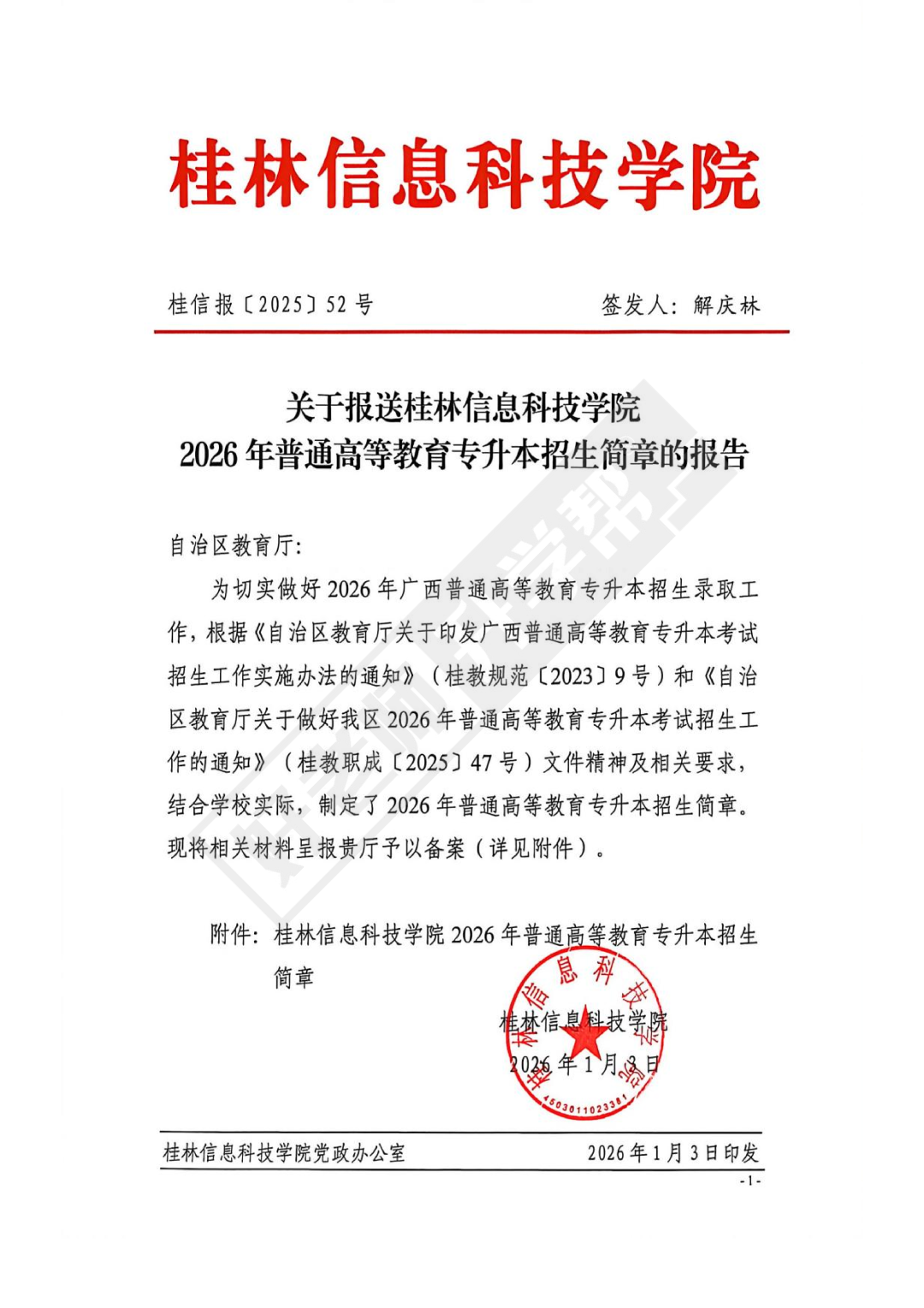 为切实做好2026年广西普通高等教育专升本招生录取工作,根据<<自治区教育厅关于印发广西普通高等教育专升本考试招生工作实施办法的通知>>(桂教规范[2023]9号)和<<自治区教育厅关于做好我区2026年普通高等教育专升本考试招生工作的通知>>(桂教职成[2025]47号)文件精神及相关要求,结合学校实际,制定了2026年普通高等教育专升本招生简章。现将相关材料呈报贵厅予以备案(详见附件)。