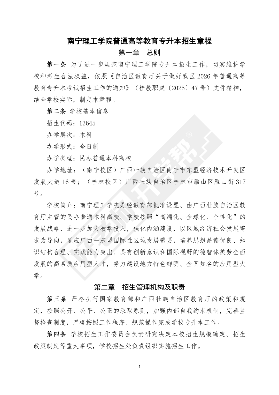 为了进一步规范南宁理工学院专升本招生工作,切实维护学校和考生合法权益,依照<<自治区教育厅关于做好我区2026年普通高等教育专升本考试招生工作的通知>>(桂教职成(2025)47号)文件精神,结合学校实际,制定本章程。