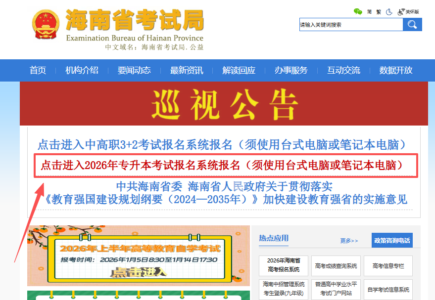 首先同学们需要登录“海南省考试局官网”,点击进入“海南专升本报名系统”。http://ea.hainan.gov.cn/