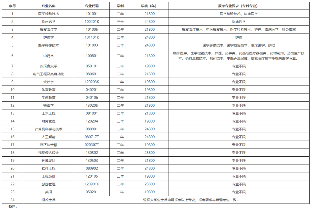 专升本学生(含退役大学生士兵)为我校普通全日制学生,除临床医学为3年制外,其余均为2年制。不得采取非全日制学习形式就读,入学后不得转专业和转学。