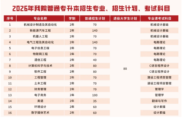导读:湖北工业大学工程技术学院 2026 年普通专升本总计划招生 1305 人,其中: 普通考生计划:1225 人 退役大学生士兵计划:80 人