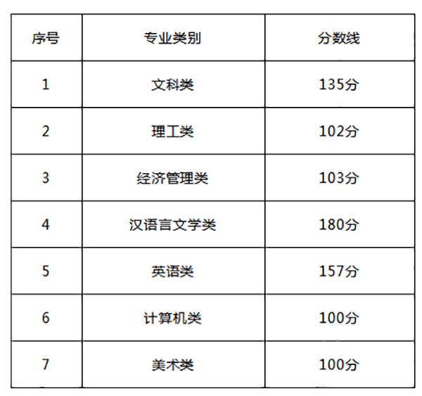 从表格知道该院校的2021年专升本的招生大类一共有7个。不过相对该院校2020年的专升本招生大类,减少了数学类,体育类,音乐类的招生,各大类的专升本分数线同学们可以对照表格查看,其中汉语言文学类的专升本分数线较高,是180分;计算机类和美术类的专升本分数线较低,都是100分。