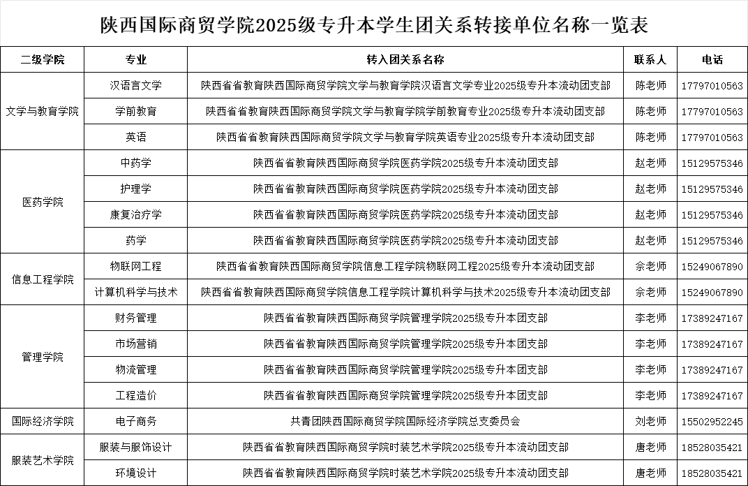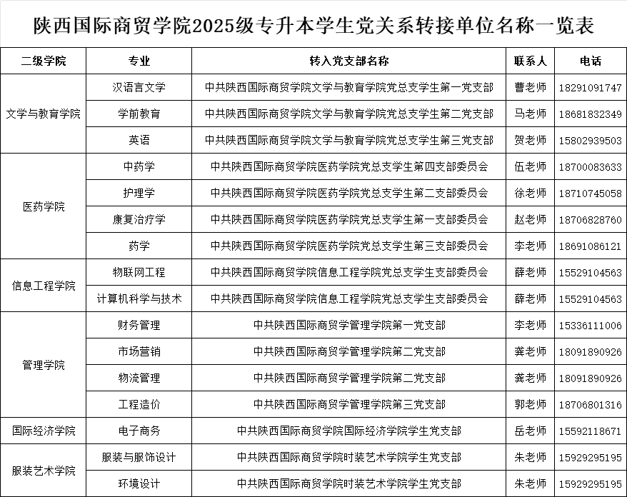 档案转寄地址 学校名称: 收件地址: 收件人: 联系电话: 邮编: 注意事项: 党关系转接流程 学生可通过陕西省党建信息化平台发起线上转接,携带党员档案到所录取学院报到; 详见 (https://dwgzb.csiic.com/info/1015/1768.htm) 团关系转接流程 联系我们 同学们再有什么问题可以根据毕业院校联系下方老师!