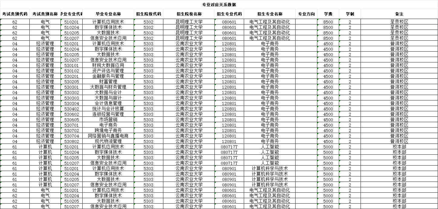 根据云南省教育厅、省招生考试院对2026年普通高校专升本招生工作的通知安排,现对学校毕业专业对应报考的本科院校名称、专业类别、专业代码、专业名称、报考类别等内容进行公示(名单见附件)。公示期间如有异议,请及时向招生与就业指导处反馈。