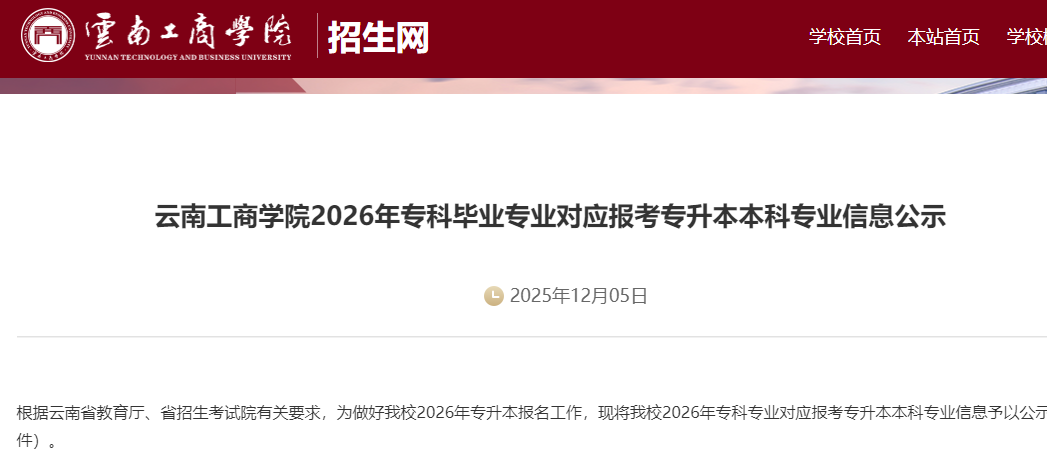 根据云南省教育厅、省招生考试院有关要求,为做好我校2026年专升本报名工作,现将我校2026年专科专业对应报考专升本本科专业信息予以公示(附件)。