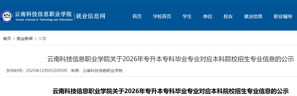 根据云南省教育厅、省招生考试院有关要求,为做好2026年专升本报名工作,现将我校2026年专科毕业专业对应本科院校招生专业信息予以公示(见附件)。公示期为2025年12月5—7日。如有异议,请以书面方式向我校毕业生就业指导中心反映,材料须包含有效联系电话和班级名称,逾期不予受理。