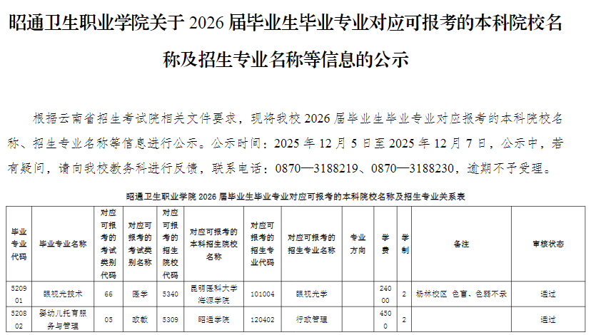 根据云南省招生考试院相关文件要求,现将我校2026届毕业生毕业专业对应报考的本科院校名称、招生专业名称等信息进行公示。