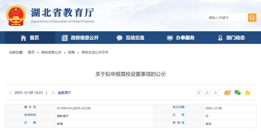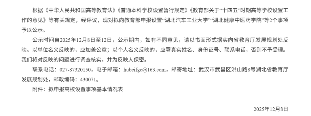 12月8日,湖北省教育厅发布关于拟申报高校设置事项的公示。根据《中华人民共和国高等教育法》《普通本科学校设置暂行规定》《教育部关于“十四五”时期高等学校设置工作的意见》等有关规定,经评议,现对拟向教育部申报设置“湖北汽车工业大学”“湖北健康中医药学院”等2个事项予以公示。湖北汽车工业学院坐落于湖北省十堰市,是全国唯一一所伴随民族汽车工业成长、发展、壮大起来并最具汽车特色的高等学府,原机械工业部直属院校,是国家“教育强国推进工程”入选高校、首批国家级现代产业学院建设单位、工信部“专精特新”产业学院获批高校,也是湖北省人民政府与东风汽车集团共建高校、湖北省产教融合示范项目入选高校、湖北省“园林式校园”“湖北省省级文明(单位)校园”。学校创建于1972年,前身是中国第二汽车制造厂组建的工人大学。经过50余年发展,学校已经成为覆盖工、管、理、经、文、法、艺等七大学科门类的多科性应用型大学。现有全日制在校普通本科生、研究生、留学生1.9万余人。学校毕业生就业去向落实率长期保持在93%左右,连续多年居省属高校前列。迄今为止已为汽车行业和社会发展培养了15万多名专业人才,一批批校友成长为汽车行业的技术管理骨干、领军人物和企业高管,学校被誉为“卓越汽车工程师的摇篮”。湖北汽车工业学院从2009年开始面向湖北省招收普通专升本考生。